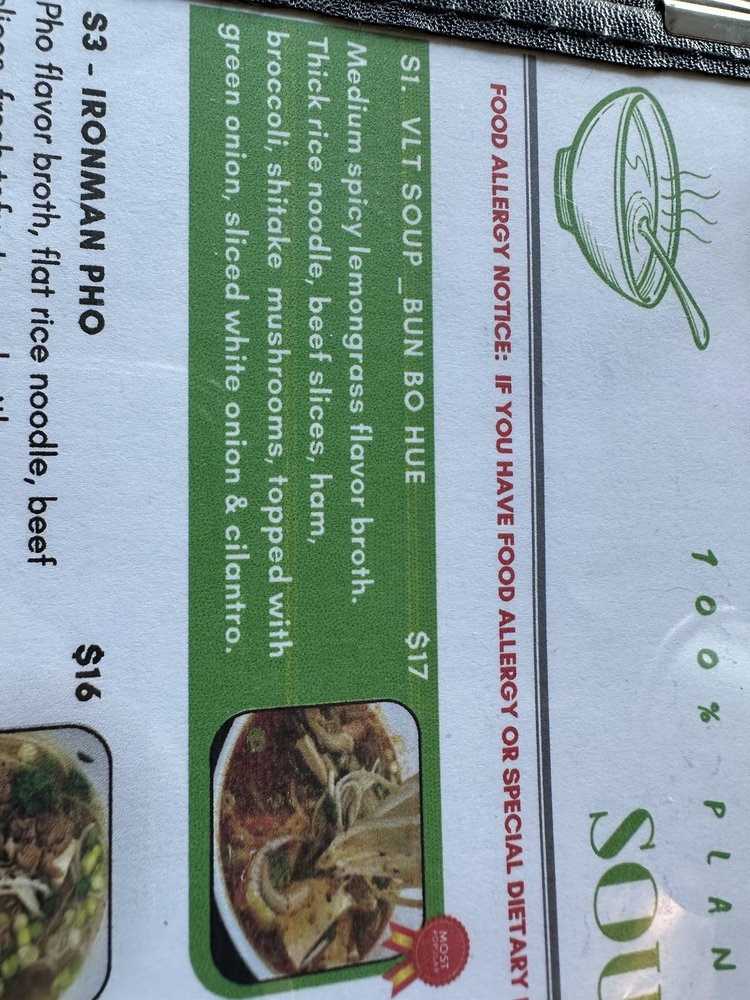 Medium spicy lemongrass flavor broth. Thick rice noodle, beef slices, ham, broccoli, shitake mushrooms, topped with green onion, sliced white onion & cilantro.Side: mixed cabbage Veggies, beansprout, mints, lemon